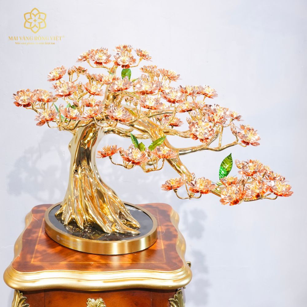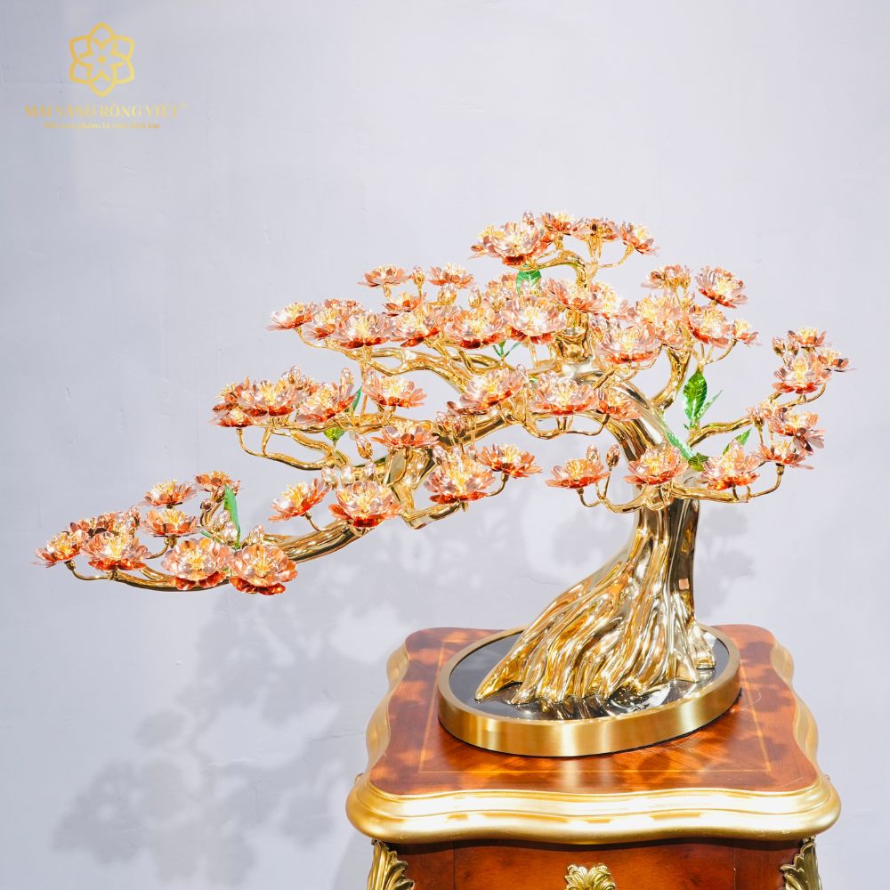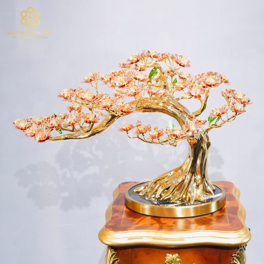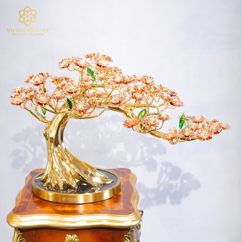Toàn bộ thân và cành được chế tác từ đồng và mạ vàng 24K bóng gương, cho khả năng phản chiếu ánh sáng sang trọng và đều màu. Phần gốc cây được xử lý nổi rễ tự nhiên, các nếp thân có độ chuyển khối mềm mại, tránh cảm giác thô cứng thường gặp ở bonsai kim loại.