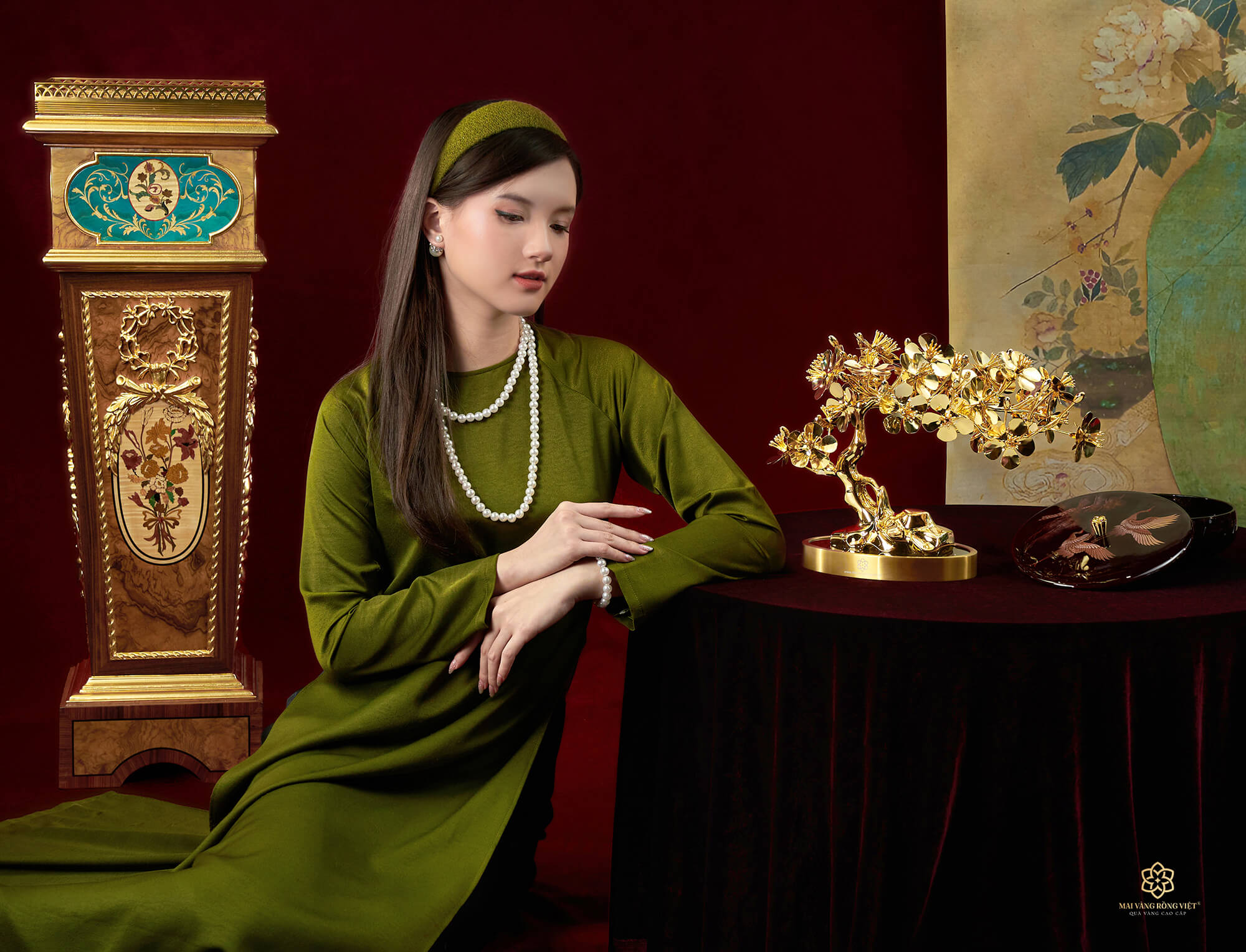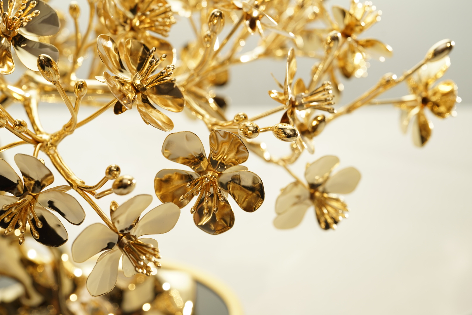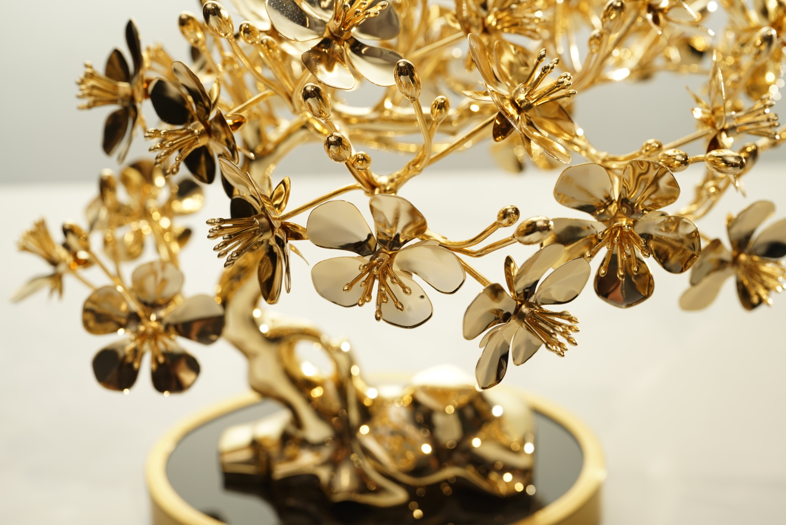 Những bông hoa mai được làm từ hợp kim đồng rồi mạ vàng 24k, mô tả hoa mai trong thời kỳ mãn khai rực rỡ nhất, tượng trưng cho những điều may mắn, hạnh phúc đang hội tụ và nở rộ. Từng chi tiết như cánh hoa, nụ hoa, nhụy hoa đều mang vẻ đẹp mềm mại tựa như hoa thật, nhờ có đôi bàn tay khéo léo của người thợ thủ công và hàng trăm giờ chế tác.