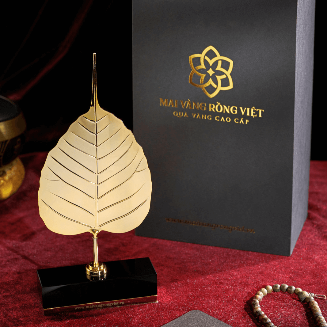 Lá Bồ Đề Hạnh Phúc Mạ Vàng 24k Đế Chữ Nhật