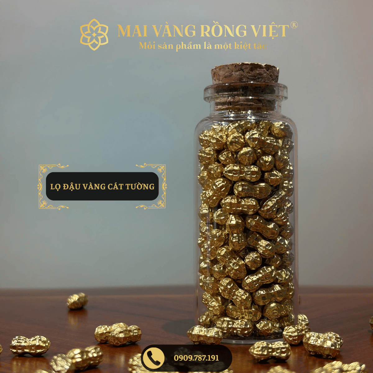 Lọ Đậu Vàng Cát Tường là vật phẩm phong thủy tượng trưng cho sự sung túc, phúc lộc viên mãn và may mắn tròn đầy. Sản phẩm gồm lọ thủy tinh trong suốt chứa những hạt đậu mạ vàng lấp lánh, mang hàm ý “gieo hạt vàng – gặt hái phú quý”, giúp gia chủ thu hút tài lộc, thịnh vượng và hạnh phúc lâu bền.