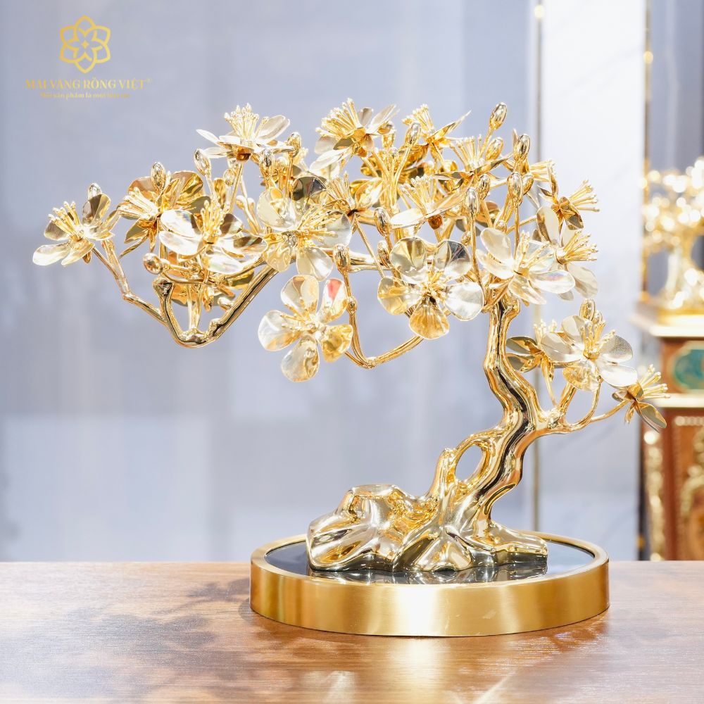 Cây mai vốn là biểu tượng của mùa xuân, khởi đầu mới và vận khí hanh thông. Khi được chế tác bằng đồng mạ vàng 24K, giá trị phong thủy của tác phẩm càng được tôn lên rõ nét. Năm cánh hoa tượng trưng cho Ngũ Phúc gồm Phúc, Lộc, Thọ, Khang, Ninh. Đây là lời chúc tròn đầy cho cuộc sống sung túc, sức khỏe và bình an.