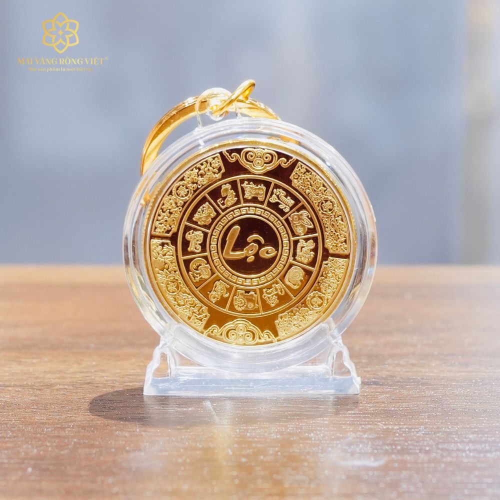Mặt sau của móc khóa được thiết kế theo bố cục hình tròn với bản đồ 12 con giáp đại diện cho thập nhị địa chi. Mỗi con giáp được khắc tỉ mỉ trong từng ô riêng, tạo cảm giác cân bằng và hài hòa năng lượng. Ở trung tâm là chữ “Lộc” cách điệu theo phong cách thư pháp truyền thống, nét khắc nổi mềm mại nhưng rõ ràng, mang thông điệp hút tài, giữ lộc và cầu mong công việc hanh thông.