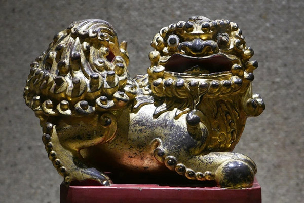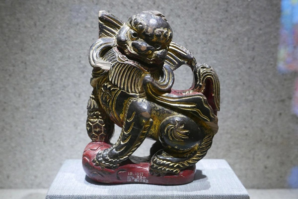Nét chạm khắc tinh xảo kết hợp màu đỏ của sơn, ánh sáng của vàng tạo nên bức tượng sư tử sinh động, quyền quý (Bảo tàng Lịch sử quốc gia)