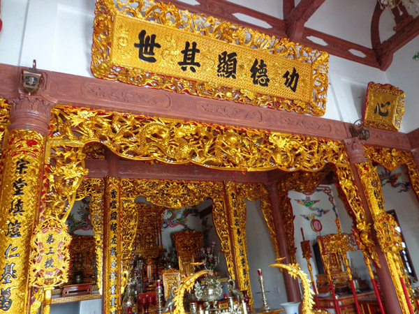 (Lớp thếp vàng được dát lên phần họa tiết, chạm trổ và chữ):