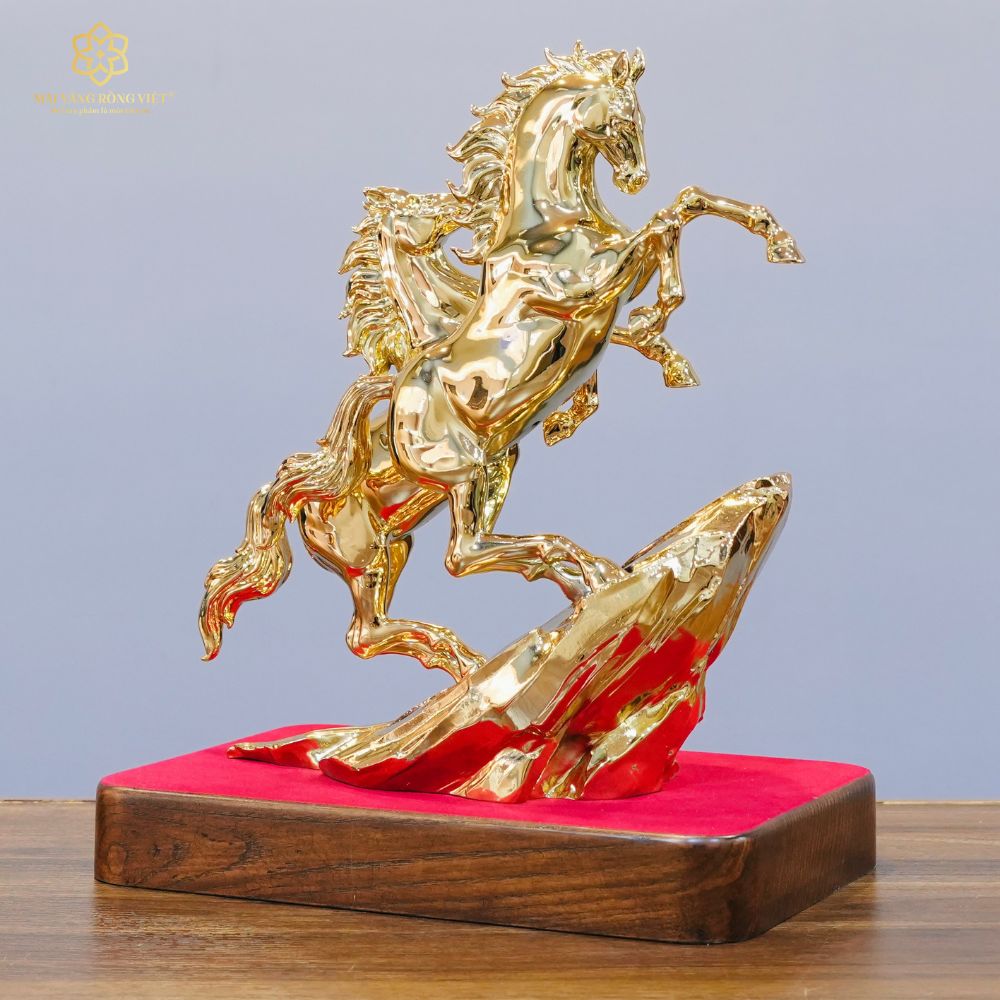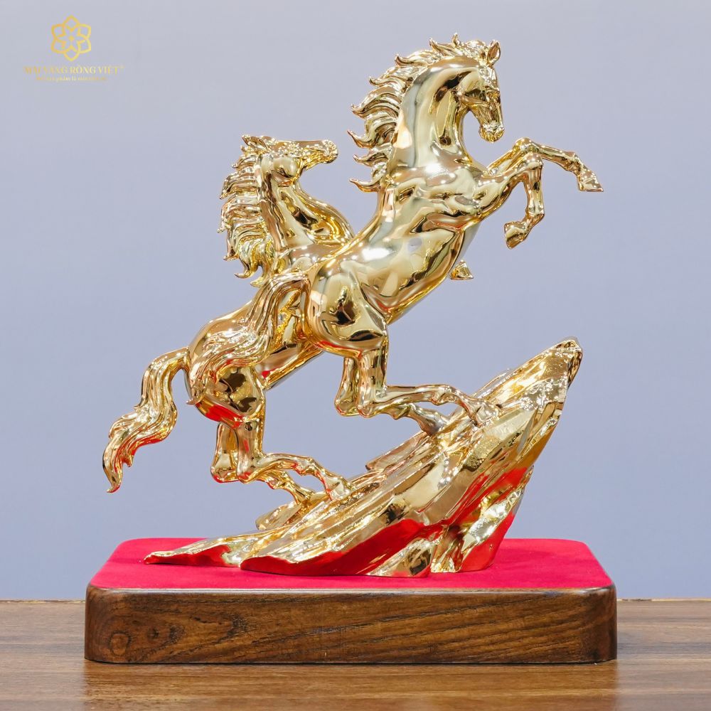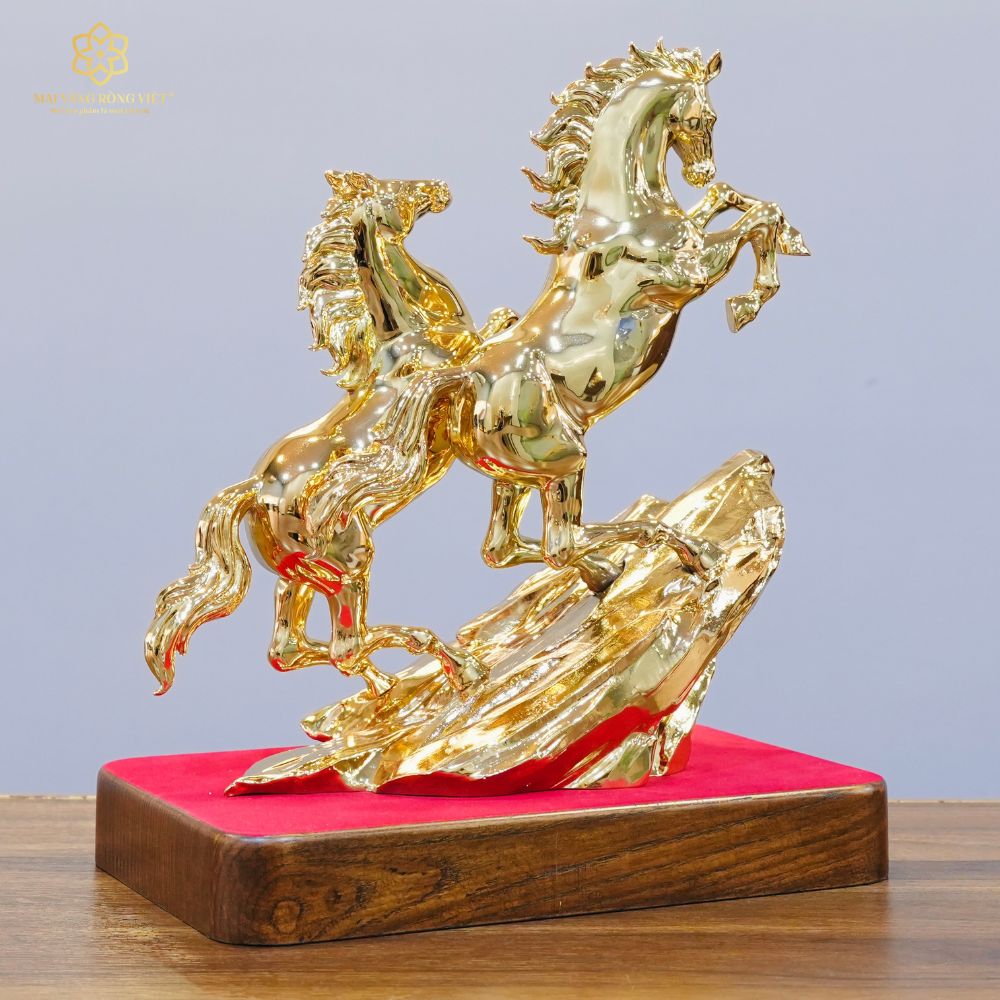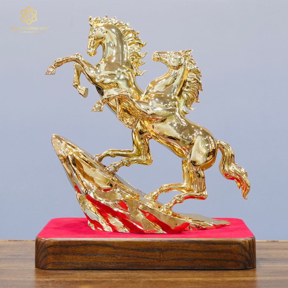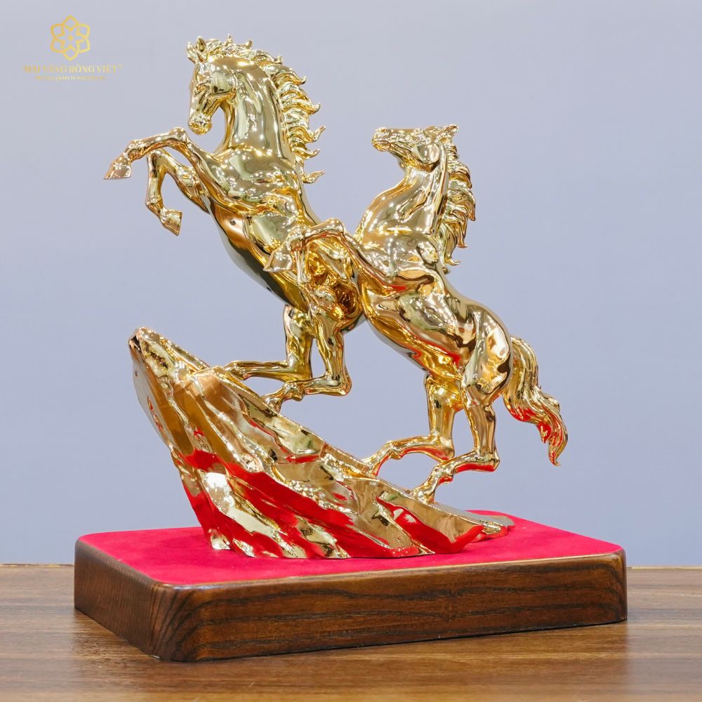 Bề mặt mạ Gold được xử lý theo hiệu ứng bóng gương hoàn hảo, tôn vinh trọn vẹn từng đường nét điêu khắc sắc sảo và đầy chiều sâu. Khi đặt dưới ánh đèn, sắc Gold phản chiếu mạnh mẽ và linh hoạt, tạo nên cảm giác chuyển động liên tục, như thể đôi ngựa đang thực sự phi nước đại giữa không gian. Hiệu ứng phản xạ ánh sáng đa chiều từ lớp mạ Gold khiến tác phẩm luôn rực rỡ, tựa như được bao phủ bởi một vầng hào quang sang trọng. Trong phong thủy, sắc vàng kim đại diện cho hành Kim và hành Thổ, góp phần kích hoạt vượng khí, hóa giải năng lượng bất lợi, đồng thời mang đến cảm giác quyền quý, thịnh đạt và bền vững cho không gian sở hữu.
