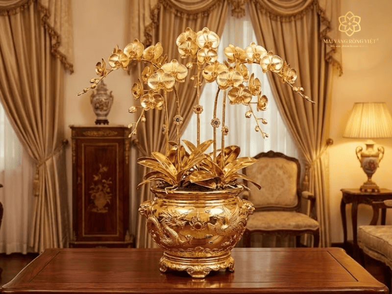 Vẻ đẹp kiêu sa, đài các của hoa lan được bất tử hóa bằng vàng 24K. Chậu lan mạ vàng mang đến biểu tượng của sự sinh sôi, đông con nhiều cháu và cuộc sống vương giả.