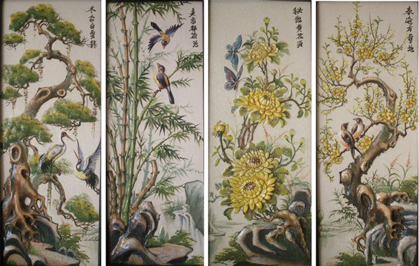 Tranh dán tường, tranh thêu hoặc những tác phẩm trang trí nội thất khác mang hình ảnh Tùng cúc trúc mai thường làm cho không gian sống thêm phần thanh nhã và trang trọng.