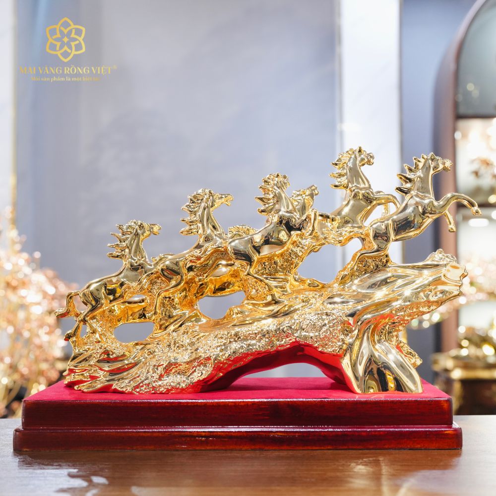 Tượng Bát Mã Truy Phong bằng đồng được chế tác tinh xảo, kết hợp giữa nghệ thuật truyền thống và công nghệ mạ Gold hiện đại cùng lớp phủ Nano giúp bề mặt luôn sáng bóng, bền màu và chống oxy hóa theo thời gian.