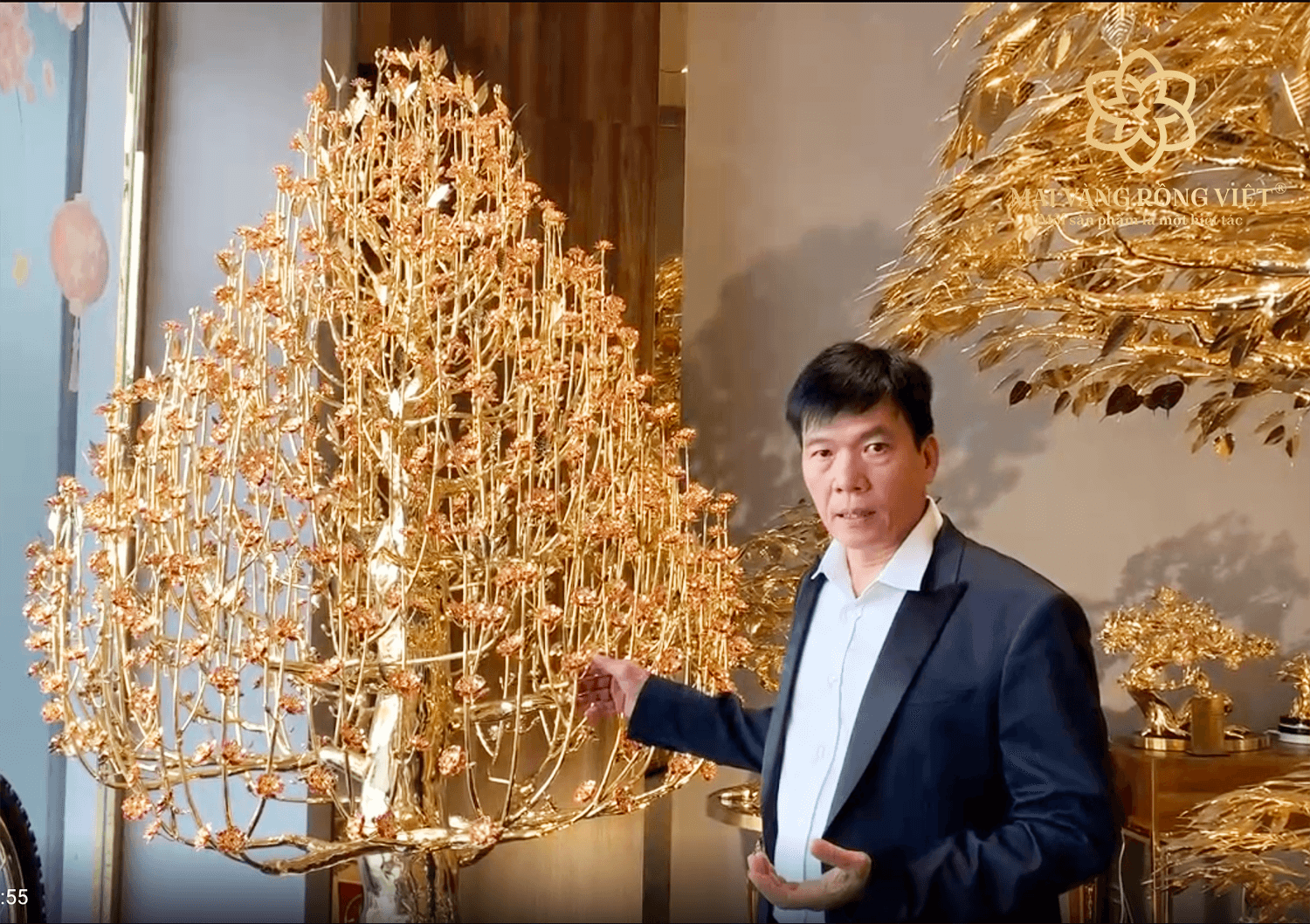 Nhằm phục vụ cho dịp Tết Nguyên đán Giáp Thìn 2024, Mai Vàng Rồng Việt (ngụ Bình Thạnh, TP.HCM) gồm 21 người thợ dành hơn 6 tháng chế tạo ra cây hoa đào đúc đồng mạ bằng 12 lượng vàng, trị giá khoảng 1,3 tỷ đồng.